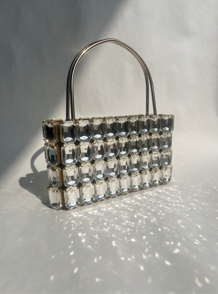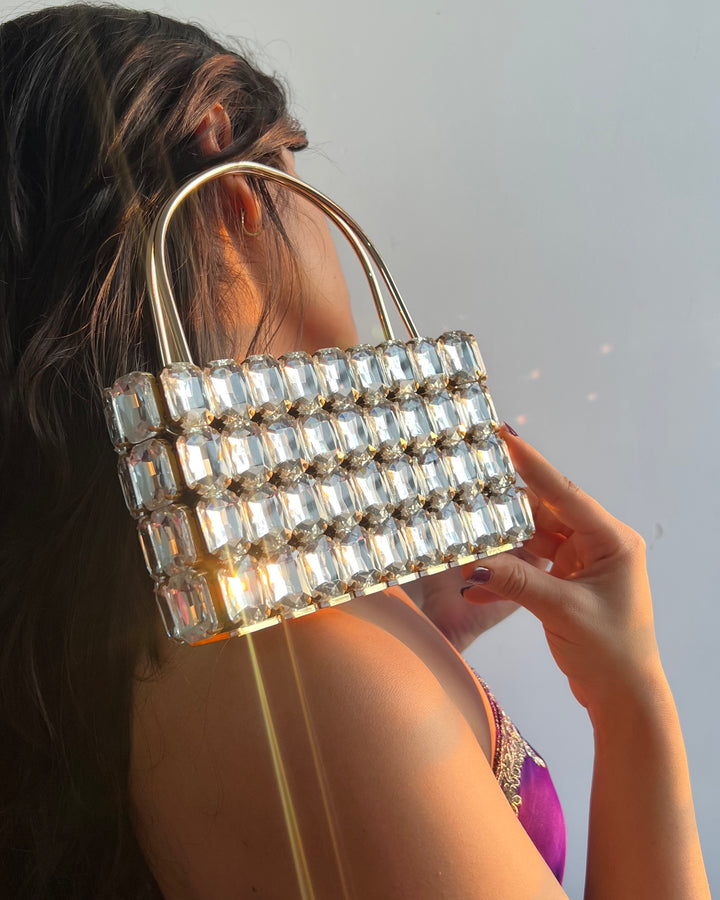 Meet the Aurora Bag — a statement piece that captures light and turns it into luxury. Handcrafted with precision, each glass crystal is meticulously set in metal frames to reflect brilliance from every angle. The structured silhouette, paired with sleek metallic handles, makes it the perfect arm candy for soirées, weddings, and everything in between.