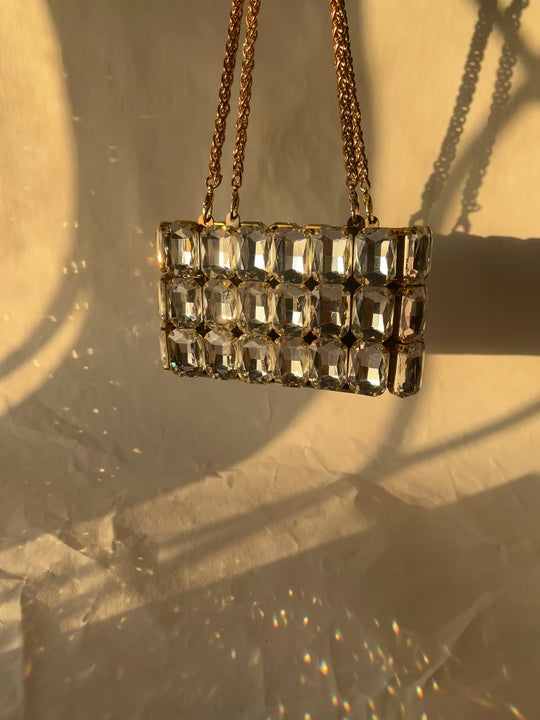Meet the Aurora Bag — a statement piece that captures light and turns it into luxury. Handcrafted with precision, each glass crystal is meticulously set in metal frames to reflect brilliance from every angle. The structured silhouette, paired with sleek metallic handles, makes it the perfect arm candy for soirées, weddings, and everything in between.