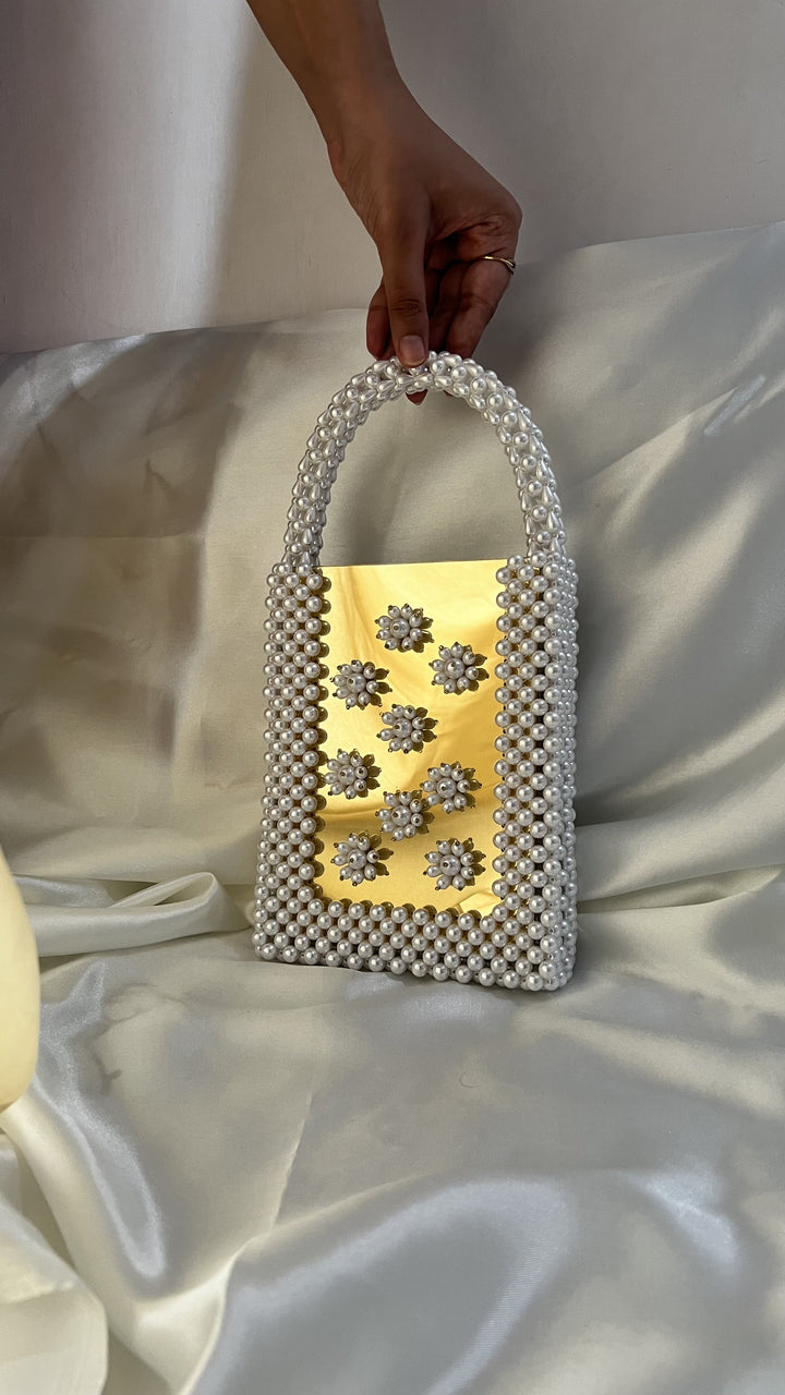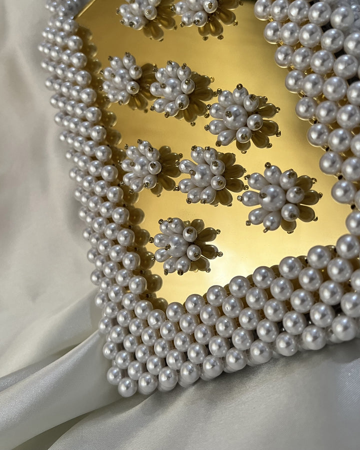 Odette, a handcrafted mini statement bag that feels like a dream. Featuring a polished gold base adorned with delicate floral clusters and framed entirely with hand-strung pearls, she’s your plus-one for every occasion that calls for something just a little more enchanted. The most elegant pairing of the golden body along with the faux pearl flowers.